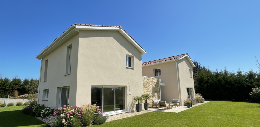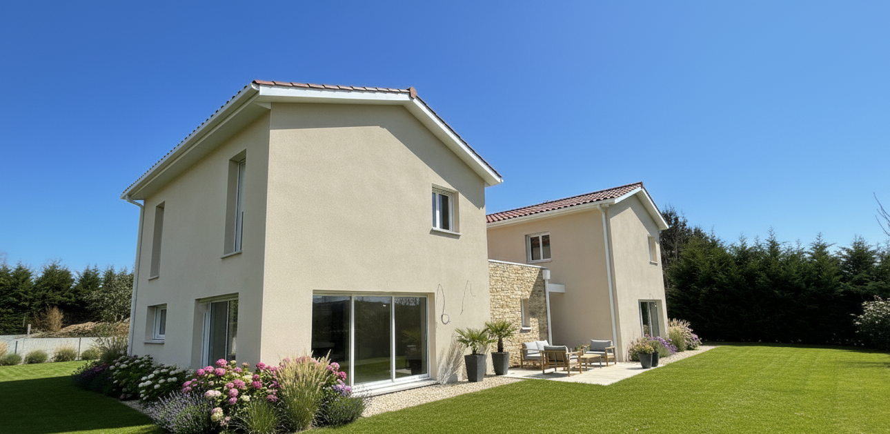 Côté extérieur, la maison présente une toiture à deux pans, soulignant un style classique et intemporel. De plus, un toit-terrasse a été aménagé au-dessus du garage, apportant une touche de modernité avec son style contemporain.