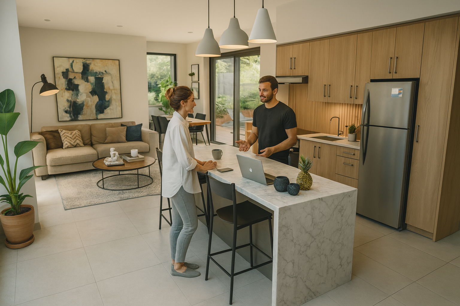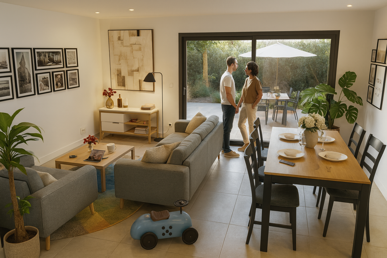 Imaginez vous détendre dans votre future maison, baignée de lumière grâce à sa pièce de vie traversante avec cuisine ouverte sur le salon.
