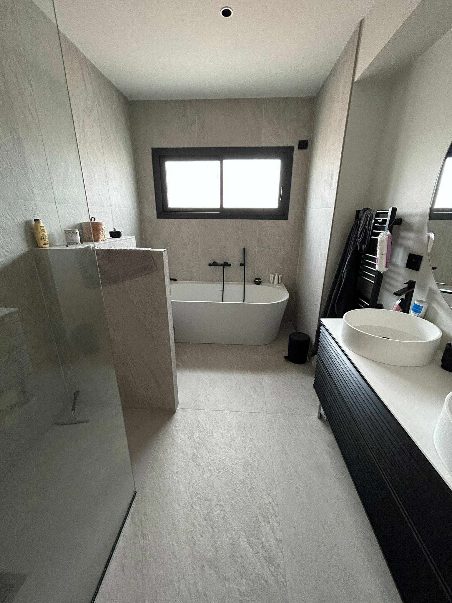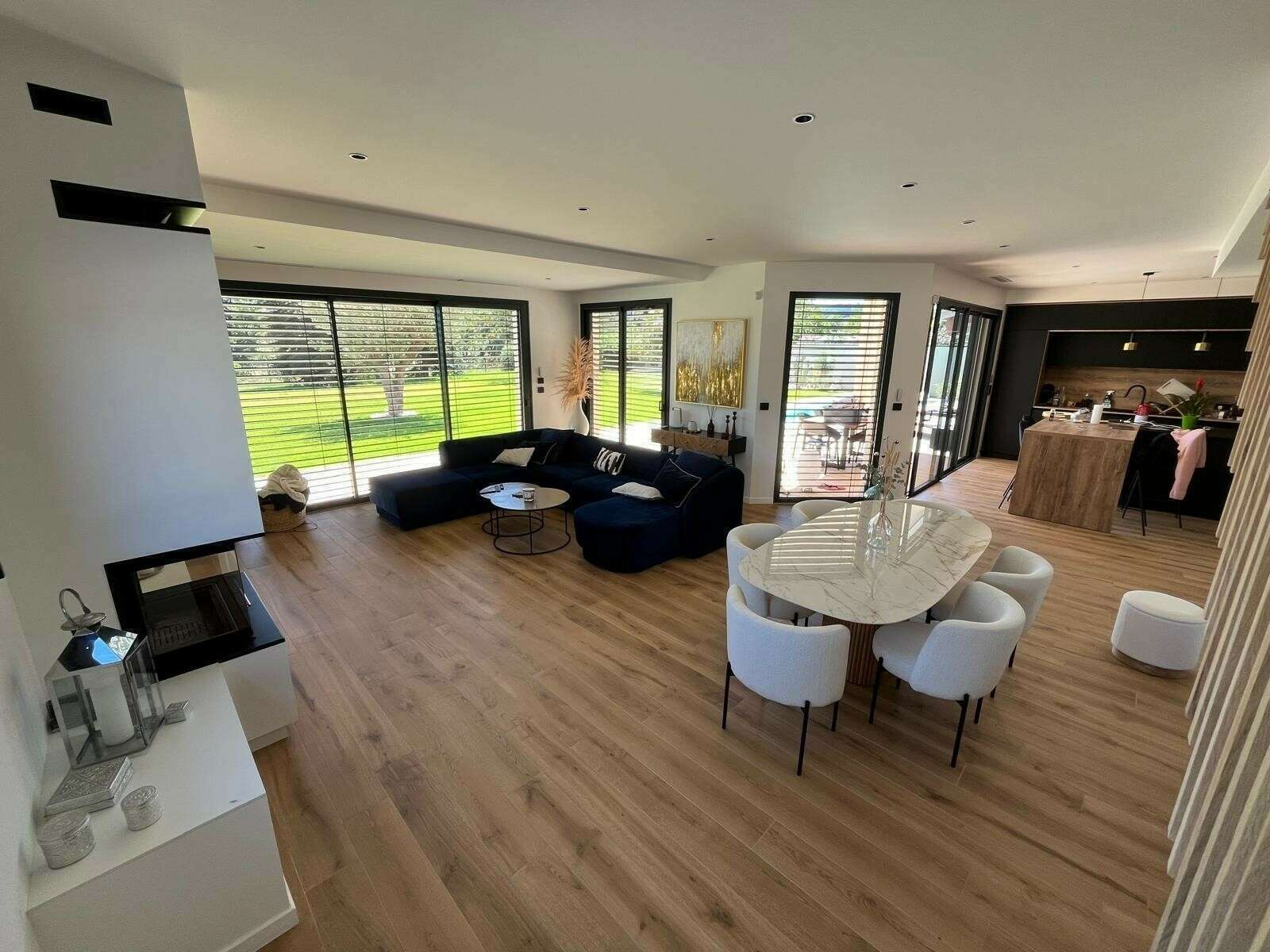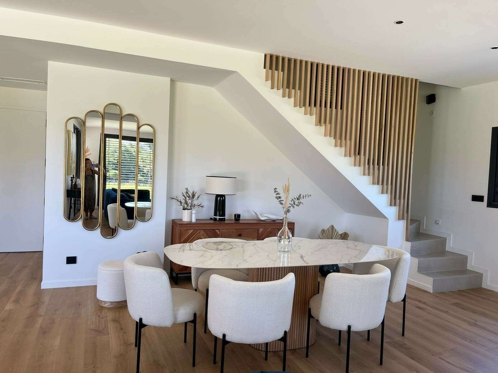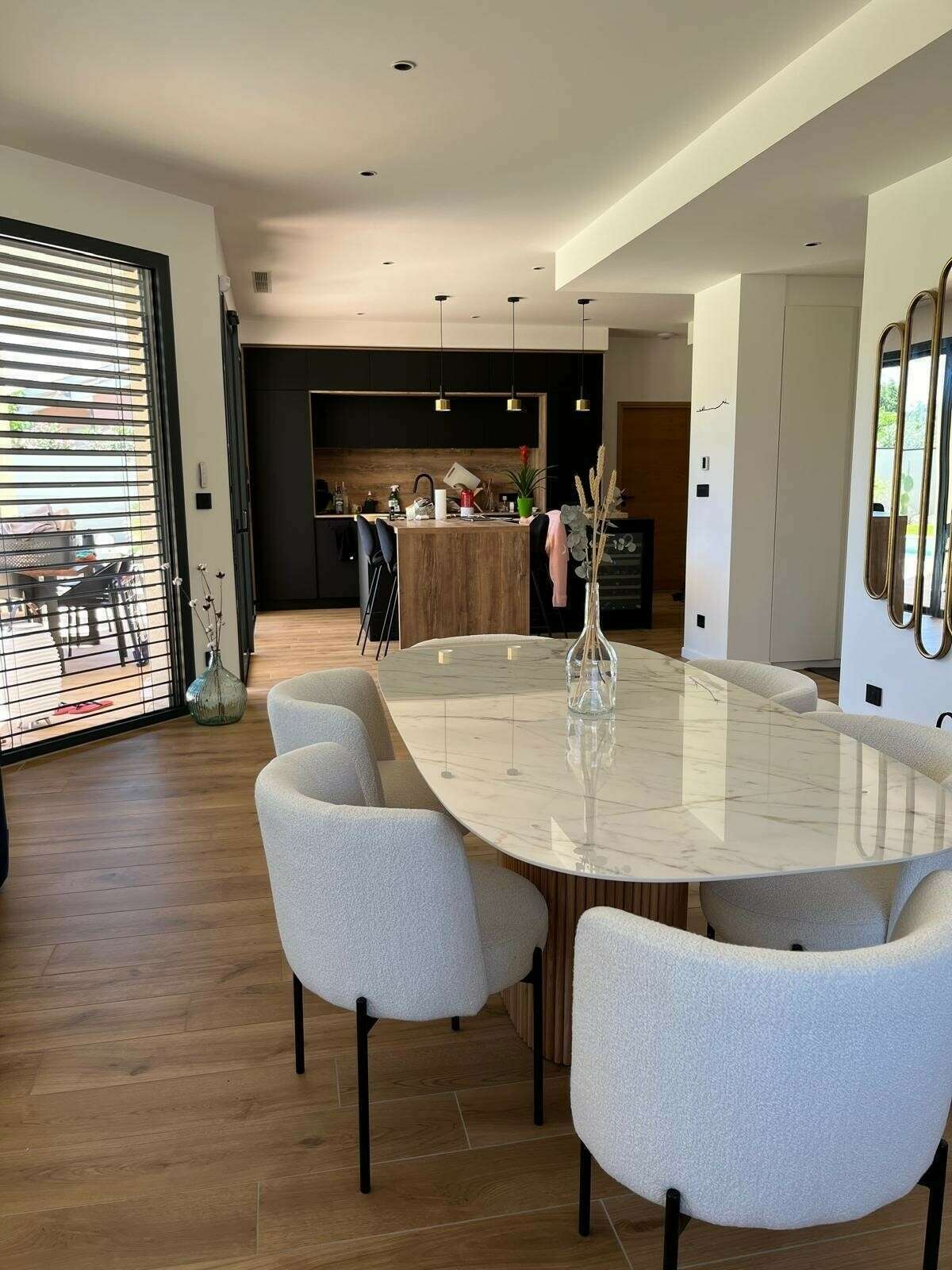 Pour cette villa d'environ 150 m², nous avons dû faire appel à nos talents de compilation. En effet, la zone d'implantation de ce lotissement ne permettait pas de positionner la piscine devant la maison. Nous avons donc décidé de décrocher l'étage pour lui laisser un peu de place et lui permettre de s'intégrer avec la pièce de vie.