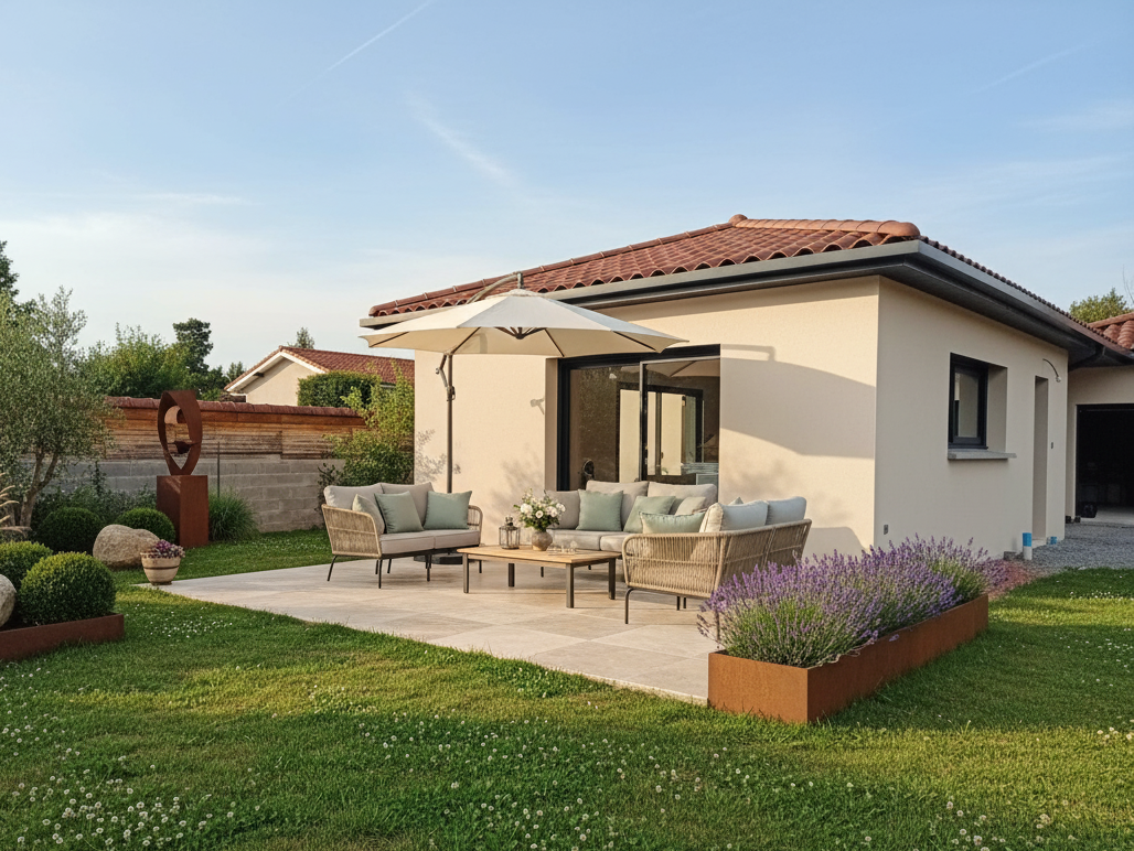 Pour cette construction, Ginette nous a consulté afin d'améliorer son confort de vie. En effet, elle habitait une grande maison qu'elle trouvait difficile à entretenir seule. Nous avons alors divisé le terrain et accompagné Ginette dans ce nouveau projet de vie. Les critères étaient de préparer son vieillissement en anticipant d'éventuelles difficultés de déplacement.