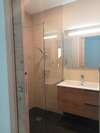 Les grandes carreaux au format 60x60 ont été utilisées dans la salle de bain et les sanitaires sont de la gamme Ottofond. Pour le chauffage, une pompe à chaleur Atlantic avec plancher chauffant a été installée pour un confort optimal toute l'année.